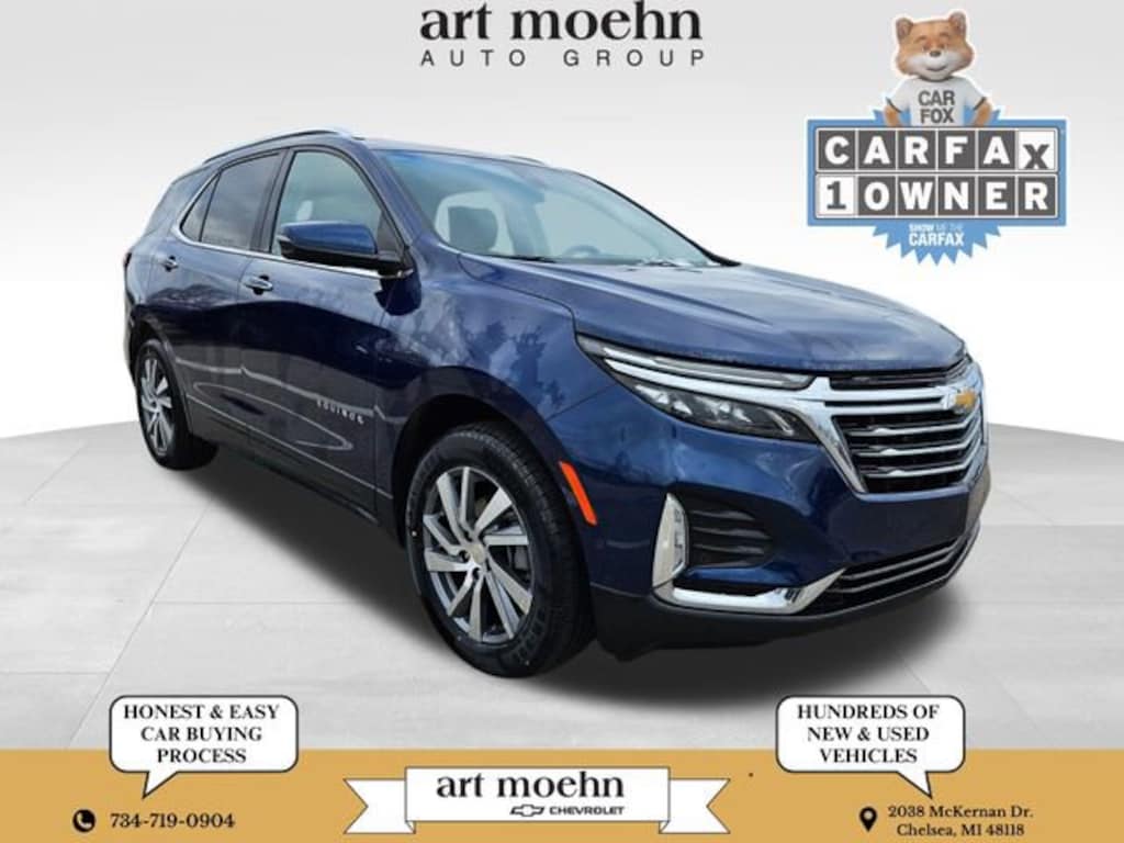 Apple Car Play/ Android Auto, Bluetooth, Remote Start, Backup Camera, Leather, Heated Seats, XM Satellite Radio, Keyless Entry, Sunroof/Moonroof, Power Liftgate, Power Seats, Local Trade, Clean One Owner Vehicle History Report, AWD All Wheel Drive, Lane Keep Assist, Front Park Assist, Wireless Charging, OnStar, Rear Park Assist, Side Blind Zone Alert, Forward Collision Alert, Cooled Seats, Fresh Oil Change, I-94 EXIT 159, AWD.Certified.Blue Glow Metallic 2023 Chevrolet Equinox Premier AWD 6-Speed Automatic Electronic with Overdrive 24/30 City/Highway MPG 1.5L DOHCChevrolet Certified Pre-Owned Details:* Transferable Warranty* Limited Warranty: 12 Month/12,000 Mile (whichever comes first) from certified purchase date* Powertrain Limited Warranty: 72 Month/100,000 Mile (whichever comes first) from original in-service date* 24 months/24,000 miles (whichever comes first) Certified Pre-Owned Scheduled Maintenance Plan and 3 days/150 miles (whichever comes first) Vehicle Exchange Program. SiriusXM 3-month trial subscription.* 172 Point Inspection* Vehicle History* Warranty Deductible: $0* Roadside Assistance