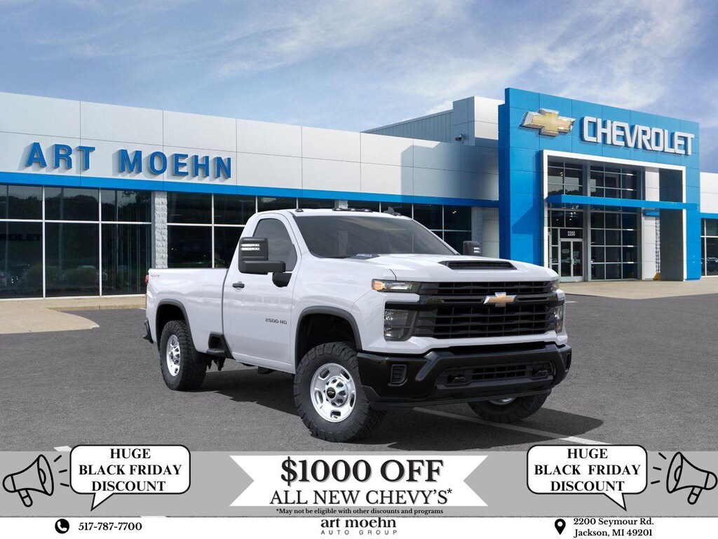 This 2025 Chevrolet Silverado 2500HD Work Truck, comes in Summit White exterior with Jet Black interior. Call us at 517-247-2048 and reference stock Number 71550 WHY THIS VEHICLE? Honest & Easy Car Buying Buying a vehicle can be a stressful experience, and we understand that. That's why we've built our business on earning your trust, and to make you feel financially protected. Through our trusted car-buying process, you'll have access to full service reports and vehicle history checks. Furthermore, we are a KBB brand top-rated dealer. A Cargurus 4-1/2 star dealer, and we have over 1,000 Google reviews! Choose Art Moehn Auto Group today, and come see how easy buying a car can be. Important Package Information Trailering Package includes trailer hitch, 7-pin connector and (CTT) Hitch Guidance (Deleted when (ZW9) pickup bed delete is ordered.), Durabed, pickup bed, IntelliBeam, automatic high beam on/off, Audio system feature, 2-speakers (Requires Regular Cab model.), Wi-Fi Hotspot capable (Terms and limitations apply. See onstar.com or dealer for details.), Driver Information Center, 3.5" diagonal monochromatic display Come to Art Moehn Chevrolet for a test drive today! Visit us at 2200 Seymour Rd Jackson MI 49201 or give us a call 517-247-2048. We hope to see you soon!